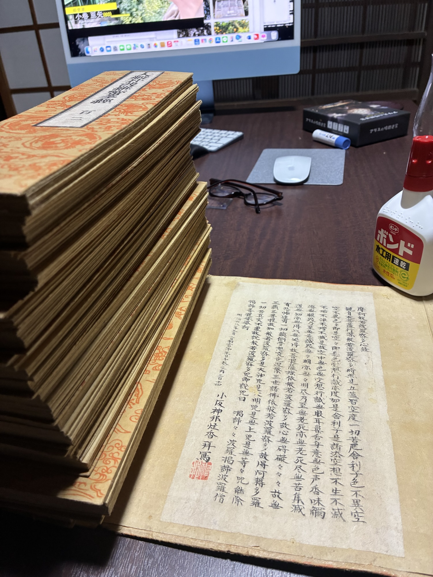 大般若経典の糊が駄目になって、経典パラパラ剥がれてしまうのでボンドで補修します。